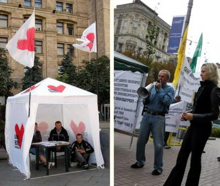 А ў тым, што ніводная рэвалюцыя, нават аранжавая:), ня робіць усіх задаволенымі, можна было лёгка пераканацца, выйшаўшы на Храшчацік. Насупраць мэрыі — намёты пікетоўнікаў. Чалавек з мэгафонам кляймуе ўлады за тое, што зачышчаюць пераходы мэтро ад дробных прадпрымальнікаў. Побач змагаюцца за свае правы нейкія сабакаводы разам з сабакамі:) Бясспрэчны прагрэс у тым, што ніхто не дастае дручком па сьпіне: пікеты пад вокнамі бацькоў гораду — дазволеныя.