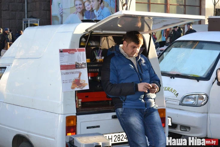Уздоўж Хрышчаціка стаяць дзясяткі аўтамабіляў, з якіх вядзецца гандаль: кава, гарбата, хот-догі, булачкі…