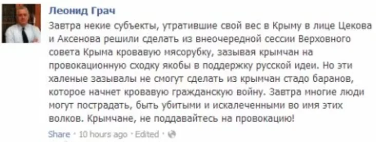 Былы старшыня Вярхоўнай Рады Крыма, а цяпер народны дэпутат Украіны Леанід Грач засцярог крымчан ад сепартызму. Ён напісаў у сваім Фэйсбуку: