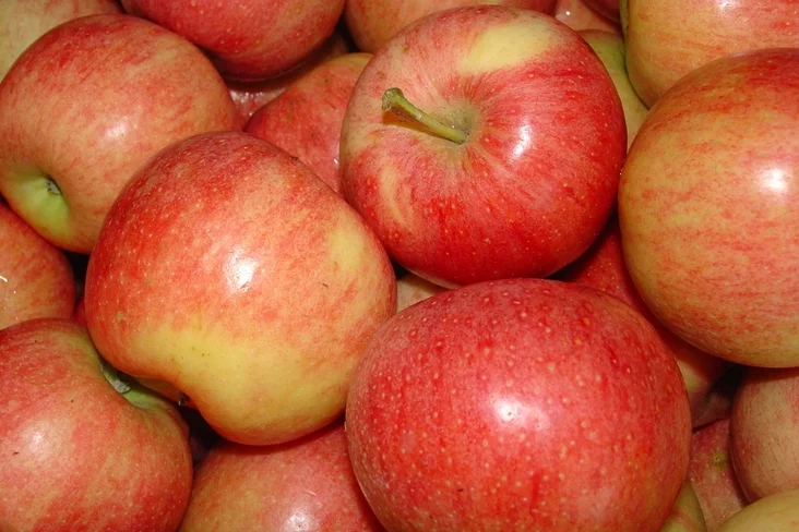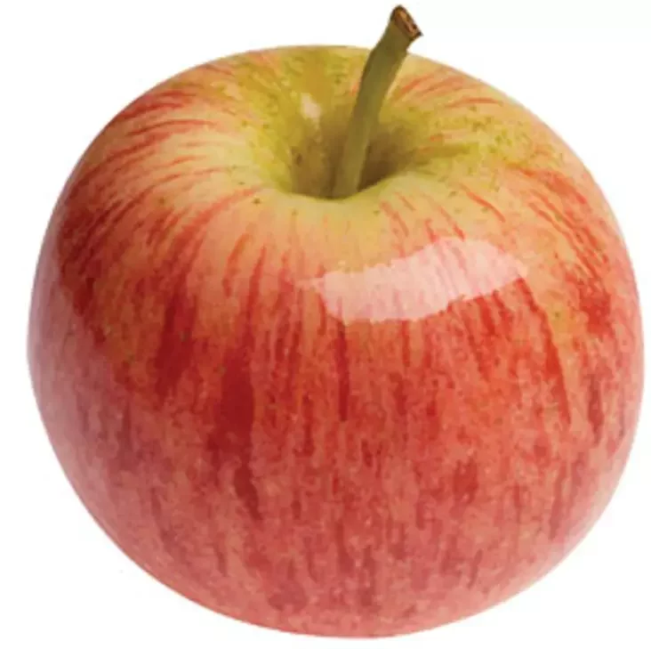 Як выглядае сорт Gala (Галя, Гала)? Гэта чырвонабокія, не пляскатыя, а круглыя яблыкі з даволі выразнымі чырванаватымі палоскамі.