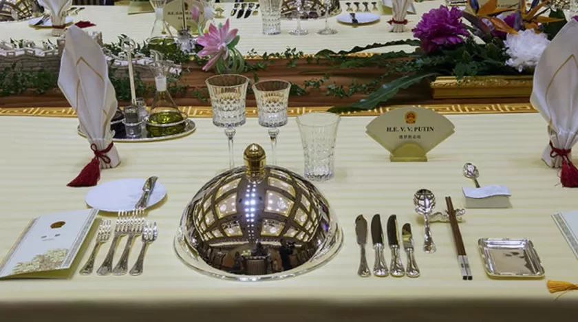 Сервіроўка месцы для Уладзіміра Пуціна ў часе афіцыйнага абеду ў кангрэс-цэнтры ў Шанхаі.