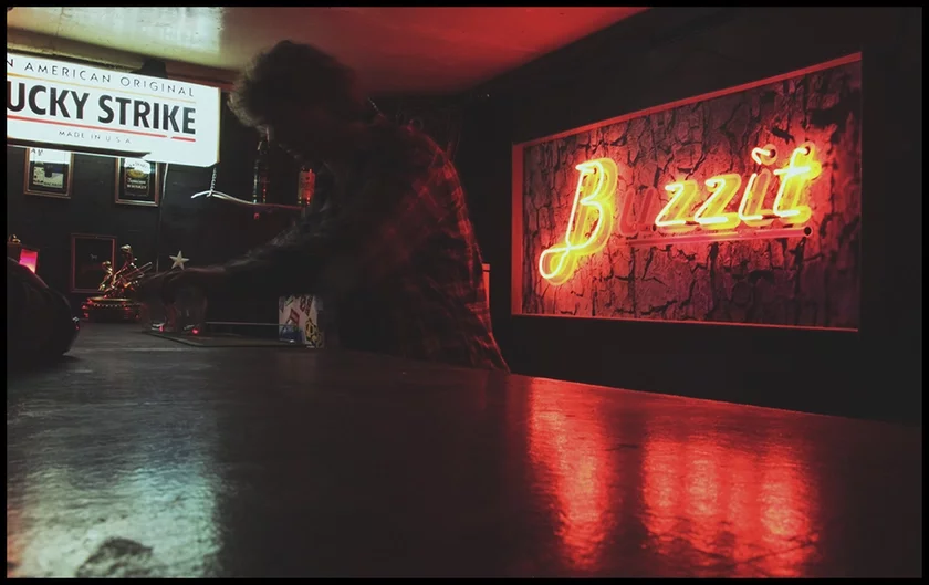 Сваё гняздзечка хлопцы пачалі рабіць тры месяцы таму. Наогул амаль усё тут зроблена з хламу: нешта пазнаходзілі на форумах кшталту «аддам дарам», нешта атрымалася адшукаць на гарышчы, тое-сёе з інтэр’еру прыцягнулі сябры. Такім чынам, увесь рамонт каштаваў хлопцам $ 100 – столькі яны патрацілі на тое, каб прыдбаць фарбу. Увайшоўшы ў BUZZIT bar, апынаешся нібы ў андэграўнднай еўрапейскай барчэле – прыемнае святло, якое дае чырвоная лямпа для фота (бацька Улада раней займаўся фатаграфіяй), барная стойка і паліцы, зробленыя са старых скейтбордаў.