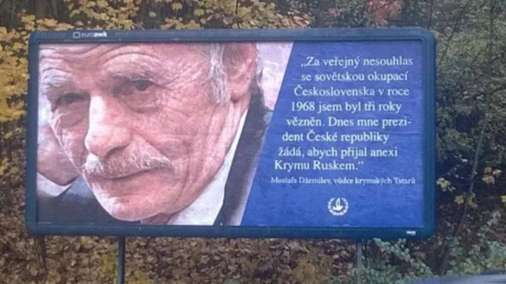 На вуліцах Прагі з'явіліся білборды з лідарам крымскіх татараў Мустафой Джамілевым, які папракае прэзідэнта Чэхіі Мілаша Земана.