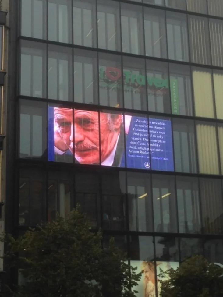 «За выраз нязгоды з савецкай акупацыяй Чэхаславакіі ў 1968 годзе я адседзеў у турме тры гады. Цяпер прэзідэнт Чэхіі заклікае змірыцца з анексіяй Крыма Расіяй», — напісана на білбордах.