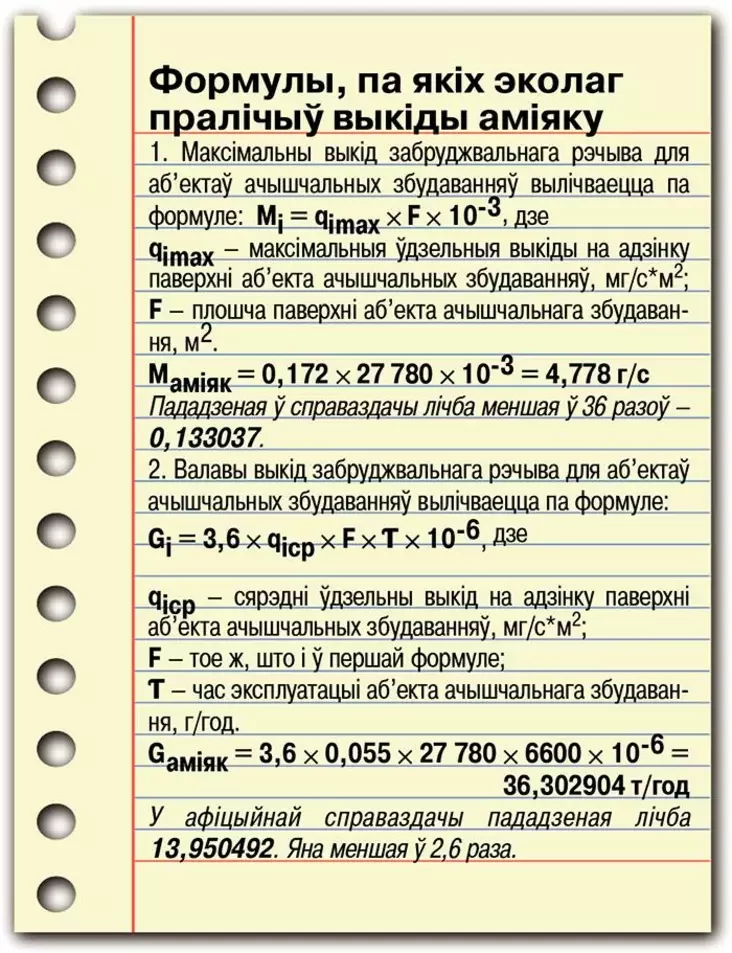 Ён пралічыў выкіды аміяку па агульнапрынятай у Беларусі методыцы, прапісанай у дапаможніку ў галіне аховы навакольнага асяроддзя і прыродакарыстання 17.08-01-2012. Ён узяў толькі адну крыніцу неарганізаваных выкідаў – гнаясховішча (пад №6034, ст.245-246, «Ацэнка ўздзеяння на навакольнае асяроддзе» свінакомплексу ў Мойсічах).