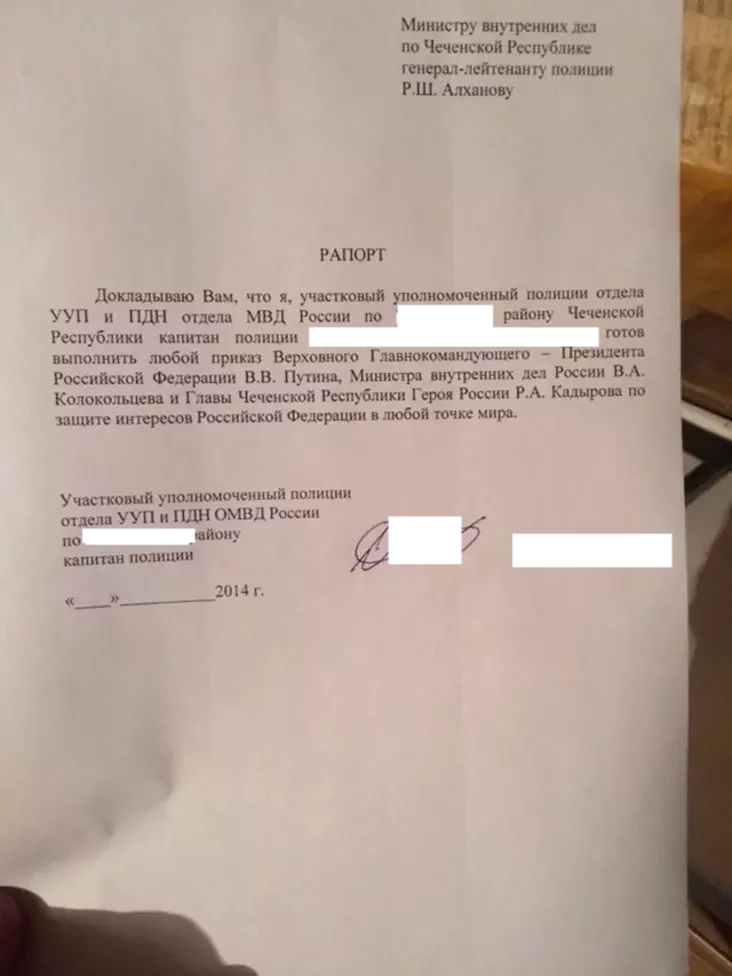 Некаторыя супрацоўнікі МУС Чачні адмовіліся падпісаць незаконны рапарт аб гатоўнасці выканаць любы загад вярхоўнага галоўнакамандуючага Уладзіміра Пуціна і кіраўніка Чачні Рамзана Кадырава.