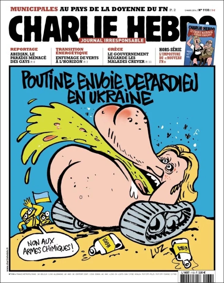 Так у адным з сакавіцкіх нумароў акцёр намаляваны ў форме танка ў атачэнні пляшак гарэлкі, што перасякае расійска-ўкраінскую мяжу. «Пуцін накіроўвае Дэпард'ё ва Украіну», гаворыць загаловак. Украінцы ўнізе пратэстуюць: «Мы супраць хімічнай зброі».
