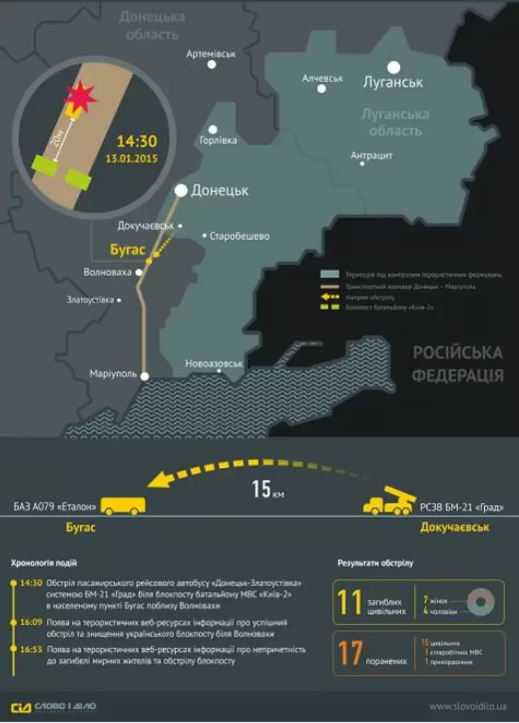 Сляды ад снарадаў на блокпосце пад Валнавахай, дзе быў абстраляны пасажырскі аўтобус, 12 чалавек загінулі, а 17 атрымалі раненні, сведчаць: ракеты былі выпушчаныя з паўночнага — паўночна-ўсходняга кірунку (прыкладна, 22,5 градуса).