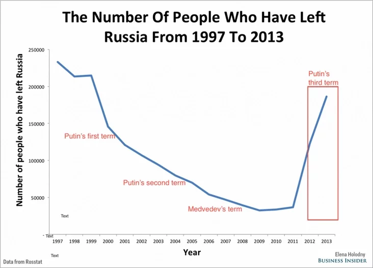 Калі выключыць уцекачоў з Украіны, з Расіі толькі ў другой палове 2014-га выехала больш за мільён чалавек.