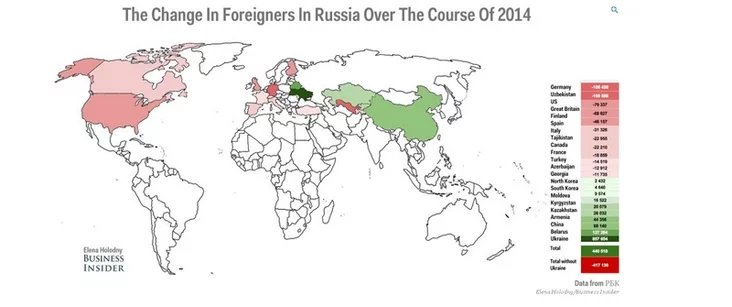 На мапе выдання Business Insider паказана, хто ў 2014 годзе пакінуў Расію, а хто туды пераехаў.