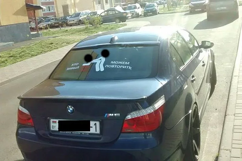 Людміла з Брэста распавядае на Facebook гісторыю пра нецэнзурную налепку на заднім шкле аўто. «Не здолела прайсці міма. Патэлефанавала ў міліцыю», — піша яна і дэманструе фота.