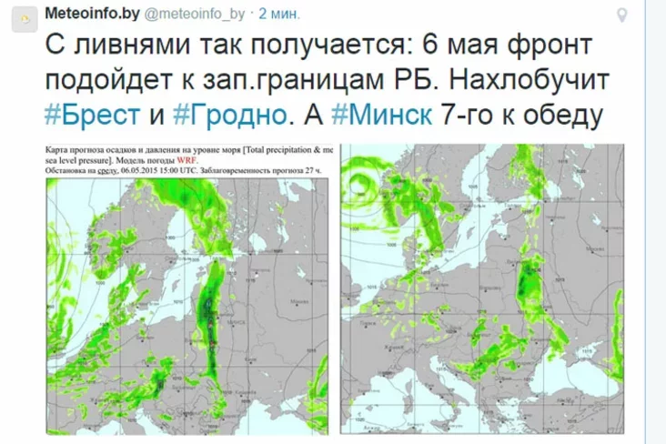 Не выключана таксама, што ў Мінску 7 мая цягам сутак выльецца да 35 л вады на кожны квадратны метр, робіць імаверны прагноз twitter meteoinfo.by.