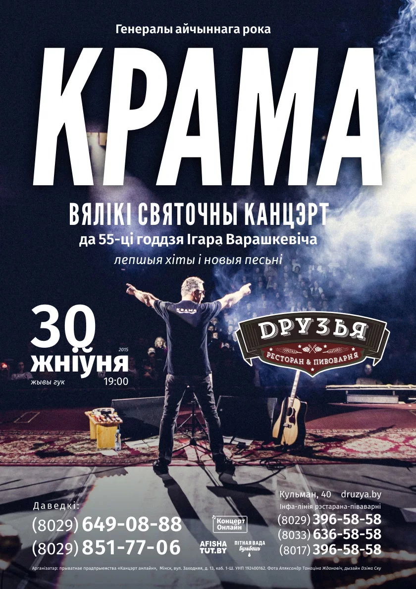 30 жніўня ў клубе «Сябры» (вул.Кульман, 40) адбудзецца вялікі святочны канцэрт гурту «Крама» «Генералы айчыннага року». Ён прымеркаваны да 55-годдзя Ігара Варашкевіча. Прагучаць найлепшыя хіты і новыя песні «Крамы».