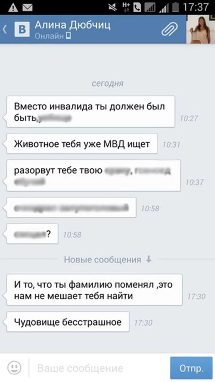 Праз некалькі хвілін Кірыла выклаў скрыншот з пагрозай у яго бок: