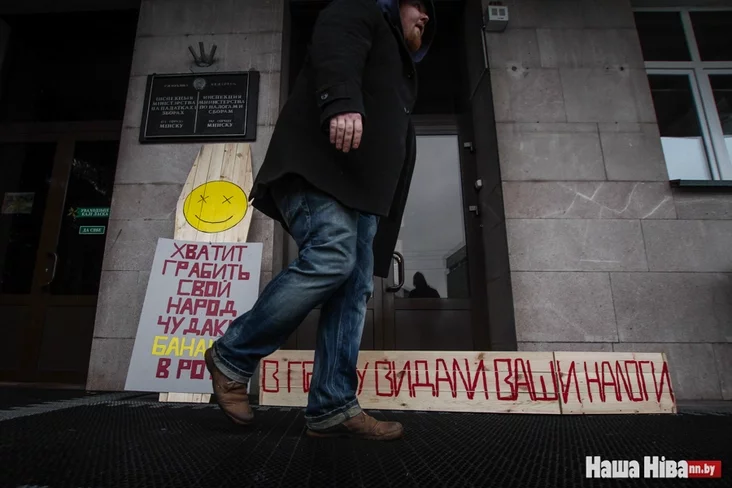 «Які гэта пікет? Пікет — гэта нешта стацыянарнае. А мы прынесьлі труну з надпісам, я таксама прынёс плякат, і паклалі на ганку падатковай. Паставілі ўсё і сышлі. Гэта быў такі пэрформанс, інсталяцыя», — даводзіў актывіст.