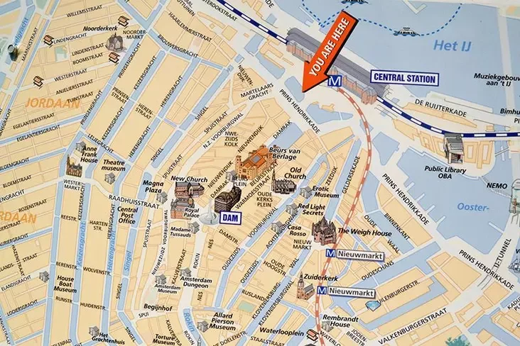 Але пачыналася ўсё досыць добра. Мы прыбылі на галоўны чыгуначны вакзал Амстэрдама зранку, з Гаарлема, дзе спыніліся, і першапачатковай і досыць складанай задачай стала арыентацыя ў прасторы. Амстэрдам практычна збудаваны на каналах, і гэта стварае складаную і заблытаную сістэму вуліц, дзе няма простых кірункаў і вельмі лёгка заблукаць. Праўда, ля вакзала вісіць вялікая мапа горада, якую мы сфоткалі і перыядычна скарыстоўвалі, пакуль недзека не знайшлі звычайную мапу, якая нас сапраўды шмат разоў выратоўвала, без мапы ў гэтым горадзе пачаткоўцам даводзіцца вельмі цяжка.