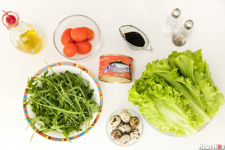 Здрабніце лісты салата, тое ж самае зрабіце з рукалай (не шкадуйце зелені: у хмурнае надвор’е яна радуе і вочы, і страўнік). Усю гэтую зялёную масу шчодра ўвільгатніце бальзамічным воцатам і алеем. Далей можна дадаваць царыцу гэтай закускі — кансерваваную гарбушу. Здрабняем да эстэтычных вашаму воку памераў памідоры чэры, чысцім і наразаем перапяліныя яйкі. Дадаём новыя інгрэдыенты да раней падрыхтаваных, пасыпаем соллю і перцам па гусце. Не забываемся ўсё якасна перамяшаць. Вуаля — смачны і карысны салат гатовы!