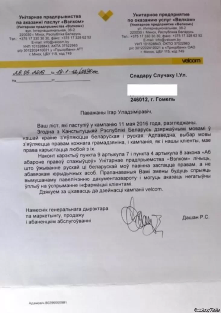 У той час як МТС ягоную ініцыятыву вітала, velcom настойваў на тым, каб ужываньне беларускай альбо расейскай мовы было правам, а не абавязкам юрыдычных асобаў.