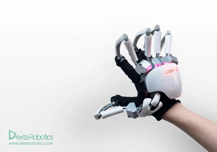 Яшчэ далей пайшла кітайская кампанія Dexta Robotics. Яна выпусціла рэвалюцыйны прадукт Dexmo, які дазваляе не толькі рухаць віртуальныя прадметы, але і адчуваць дотыкамі іх форму і фізічныя ўласцівасці. На кожны палец дзейнічае зваротная сіла, якая імітуе дотыкавыя адчуванні. Інакш кажучы, калі вы будзеце бачыць у віртуальнай рэальнасці гумавую качку, вы зможаце яе паціскаць. А вось віртуальны камень будзе заставацца на дотык цвёрдым. Аб’ект будзе адчувацца так, быццам ён знаходзіцца ў руках.