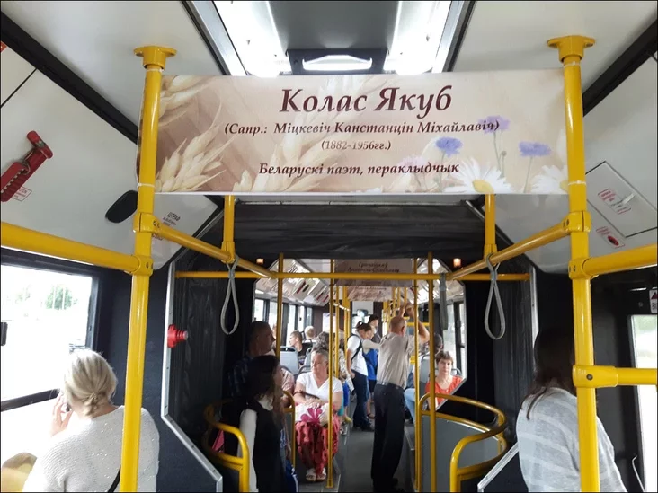 На левым боку — партрэты двух беларускіх песьняроў: Янкі Купалы і Якуба Коласа. На правым — згадкі пра Дзень беларускага пісьменства, які сёлета праводзіцца на Гомельшчыне ў Рагачове. А ў салёне ўгары паміж поручнямі замацаваны акуратныя плякацікі з партрэтамі ды імёнамі беларускіх паэтаў і пісьменьнікаў на фоне каласоў, валошак і рамонкаў: Максім Багдановіч, Якуб Колас, Уладзімер Караткевіч, Ніл Гілевіч, Максім Танк, Анатоль Грачанікаў.