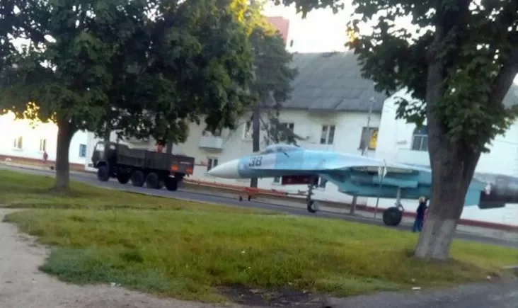 Як паведамляе »Інтэкс-Прэс», у сацыяльных сетках здымак самалёта з такім жа нумарам «38» з'явіўся раніцай 8 верасня. СУ-27 везлі па вуліцы Войкава ў Ваенным гарадку ў Баранавічах.