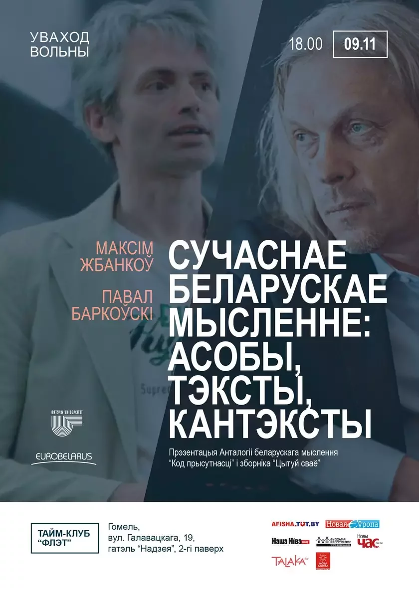 9 лістапада Лятучы ўніверсітэт і Міжнародны кансорцыум «ЕўраБеларусь» запрашаюць на сустрэчу з філосафамі Максімам Жбанковым і Паўлам Баркоўскім, падчас якой будуць прэзентаваныя выдавецкія праекты Году беларускага мыслення — Анталогія «Код прысутнасці» і зборнік «Цытуй сваё». Імпрэза адбудзецца ў гомельскім Тайм-клубе «Флэт», пачатак а 18.00.