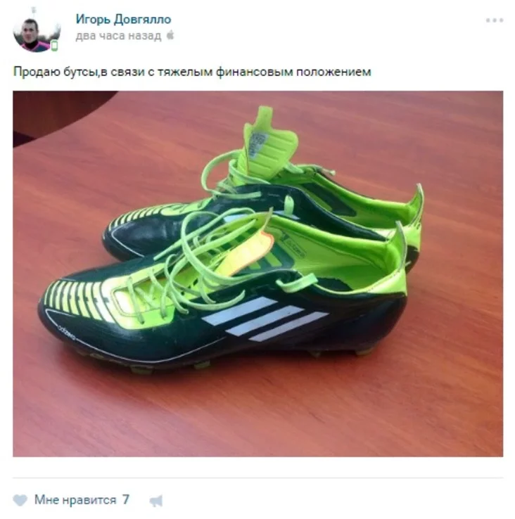Сваё рашэнне ён матываваў «цяжкім фінансавым становішчам». За гульнявы абутак adidas - памер uk 9 - футбаліст хоча 50 рублёў. Увогуле, калі ў вас такая нага і вам патрэбныя буцы, вы можаце зрабіць жыццё аднаго ўдзельніка чэмпіянату Беларусі па футболе ў вышэйшай лізе крышачку лепшым.