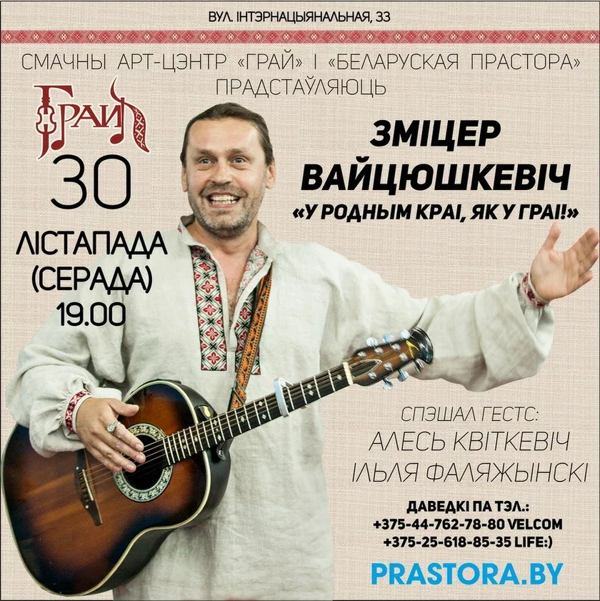 30 лістапада а 19-й гадзіне наведвальнікі «Смачнага Арт-Цэнтру ГРАЙ» па адрасе вул. Інтэрнацыянальная, 33 змогуць пабачыць, пачуць, а таксама задаць свае пытанні знакамітаму артысту і аўтару шматлікіх песень на вершы беларускіх паэтаў Змітру Вайцюшкевічу.