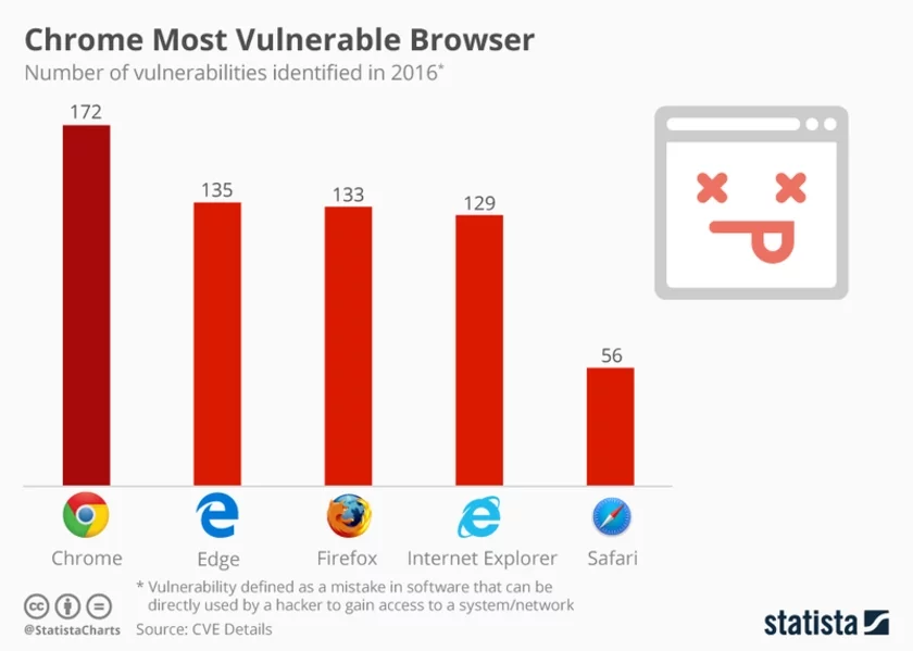 Chrome ад Google стаў самым уразлівым браўзэрам 2016 года. Пра гэта сведчыць даследаванне CVE Details, якое параўноўвае колькасць сур'ёзных памылак у праграмным забеспячэнні, што далі магчымасць хакерам атрымаць доступ да сістэмы або сеткі.