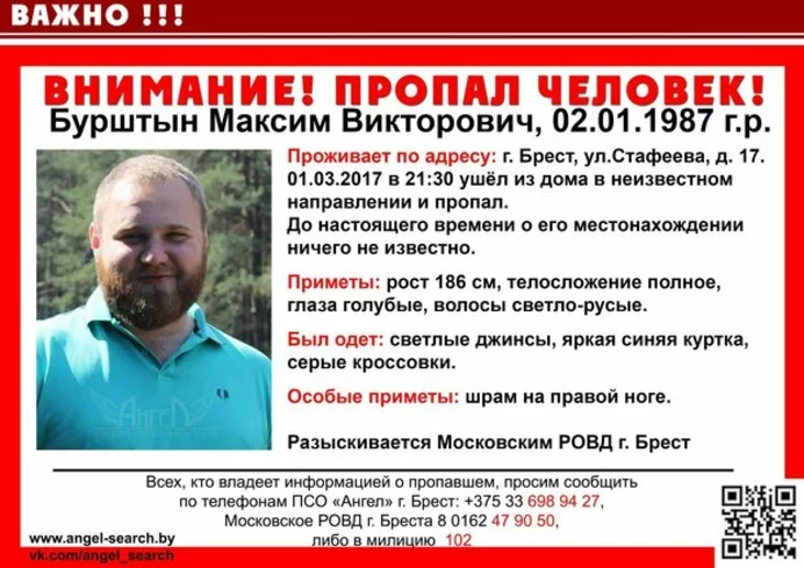 Усіх, хто валодае інфармацыяй аб зніклым, просім паведаміць па нумарах тэлефонаў: ПВА «Анёл» + 375-33-698-94-27, у Маскоўскае РАУС Брэста + 375-162-47-90-50 або па тэлефоне 102.