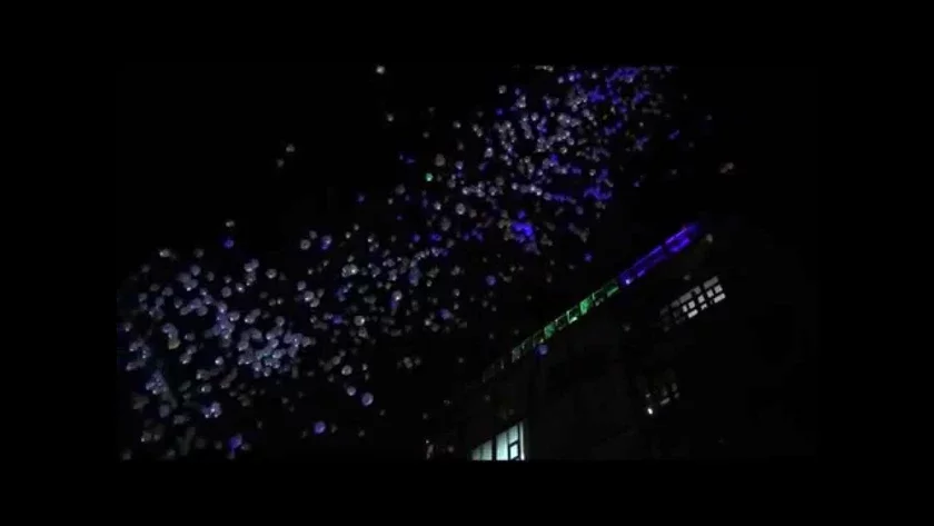 Калі геліевыя шарыкі з дыёдамі ўзнімаюцца высока, яны мігцяць, нібы зоркі, пакуль не злятаюць у далеч.