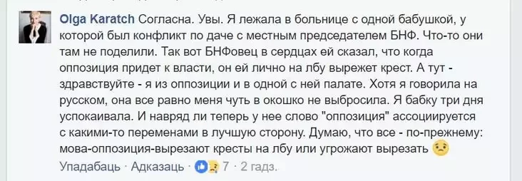 Незвычайную гісторыю распавяла віцебскі палітык Вольга Карач. У фэйсбуку яна пакінула каментар з гісторыяй пра мясцовага лідара БНФ, які гразіўся выразаць крыж на лбе суседкі.