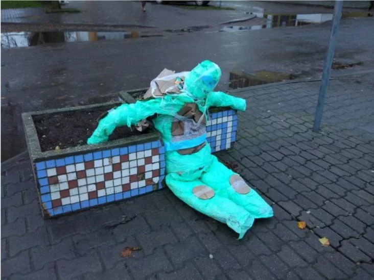 Дзіўную рэч знайшлі на цэнтральным праспекце Брэста. Фігура ў зялёным пластыку ляжала, прытуліўшыся да клумбы.