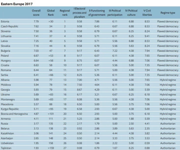 У 2017 годзе дзве краіны змянілі катэгорыі ў індэксе. Малдова з краін з «недасканалай дэмакратыяй» перасунулася ў групу «гібрыдных», а Арменія з «аўтарытарных краін» патрапіла ў спіс «гібрыдных».