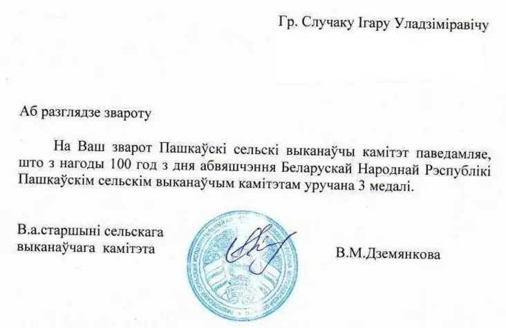 Случак запытаўся ў Пашкаўскага сельвыканкама (Магілёўскі раён), як будзе святкавацца стагоддзе з дня абвяшчэння Беларускай Народнай Рэспублікі.