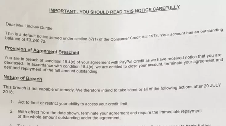 У лісце ўказвалася дакладная сума пазыкі і гаварылася: «Вы парушаеце пункт 15.4(с) вашага пагаднення з PayPal Credit, паколькі мы атрымалі паведамленне аб тым, што вы мёртвыя… гэта парушэнне не падлягае выпраўленню».