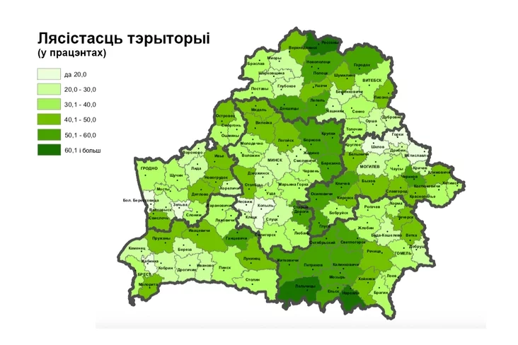 39,8% тэрыторыі Беларусі складаюць лясы. Белстат апублікаваў разбіўку лічбаў па раёнах. Адзначым, што год за годам дадзеныя адвольна змяняюцца, старыя звесткі часцяком пераглядаюцца.