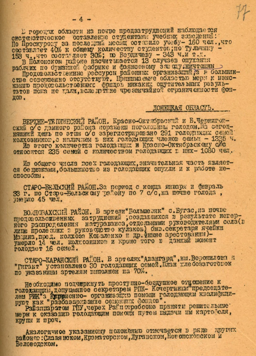 З дакладной запіскі Кіеўскага аблвыканкама СНК УССР аб цяжкім становішчы з прадуктамі ў вобласці, не пазней за 15 лютага 1933 года: