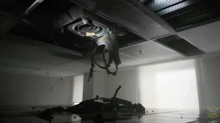 Пасля аказалася, што адбылося загаранне ізаляцыі электрапровадаў і пластмасавых элементаў вентылятарнага даводчыка (фанкойла) у памяшканні архіва на сёмым паверсе будынка.