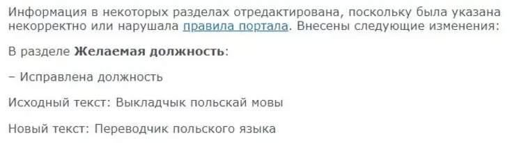 Ад рэдакцыі: Характэрна, што сайт змяніў рэзюме, бо яно парушала правілы партала. Сапраўды, калі прачытаць правілы размяшчэння вакансій і рэзюме Praca.by, можна пабачыць такое правіла 2.1.