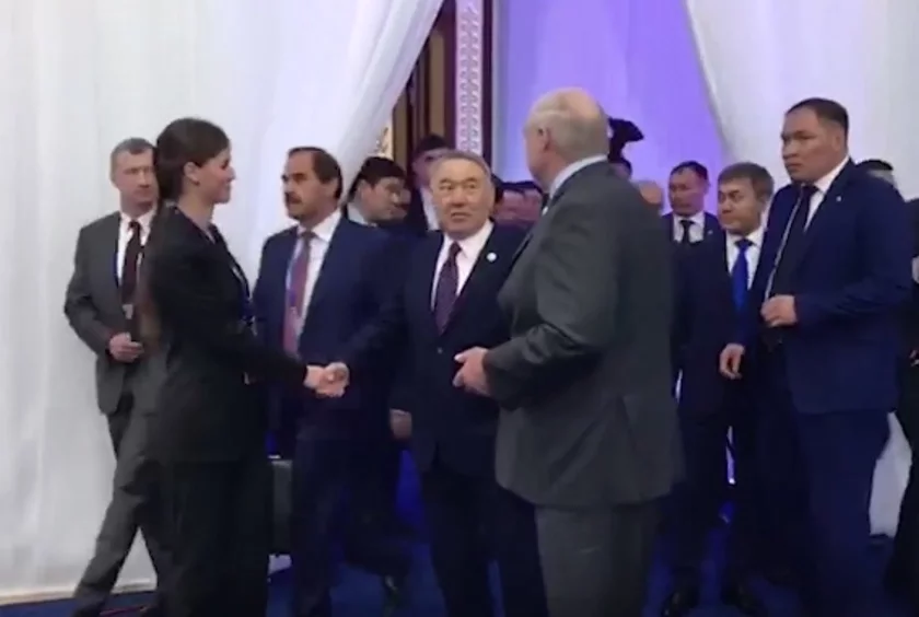 Аляксандр Лукашэнка пазнаёміў першага прэзідэнта Казахстана Нурсултана Назарбаева з работніцай службы дзелавога пратакола Дар'яй Шманай перад пасяджэннем Вышэйшага Еўразійскага эканамічнага савета ў Нур-Султане, паведамляе Life.ru.