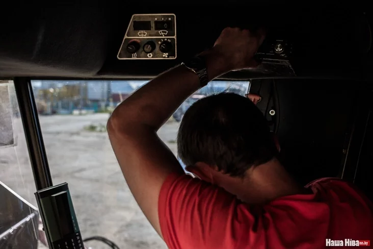 У кабіне, расказвае хлопец, у яго стаіць кандыцыянер, грае любімая музыка. Ёсць халадзільнік. Кіруе камбайнам Арцём пры дапамозе джойсціка.