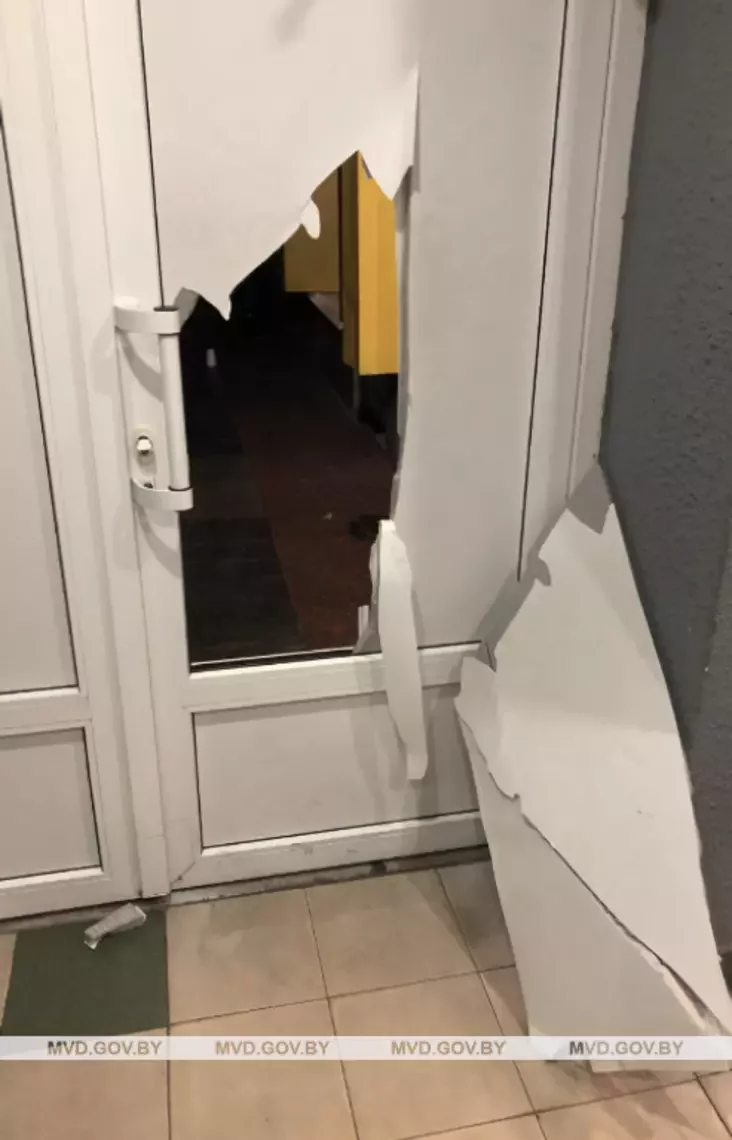 Нарад групы затрымання, што прыбыў на месца здарэння, убачыў, што ўваходныя дзверы ўстановы разбітыя.