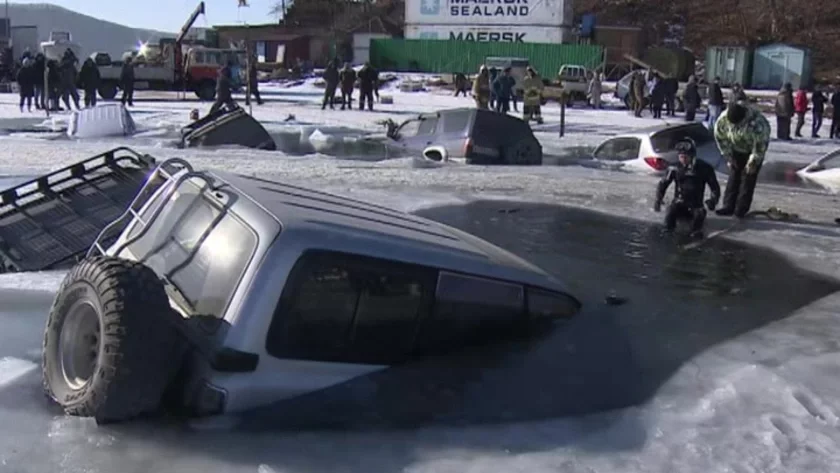 Рыбакі з Уладзівастока зладзілі на лёдзе стыхійную паркоўку: каля 30 аўтамабіляў пайшло пад лёд ВІДЭА