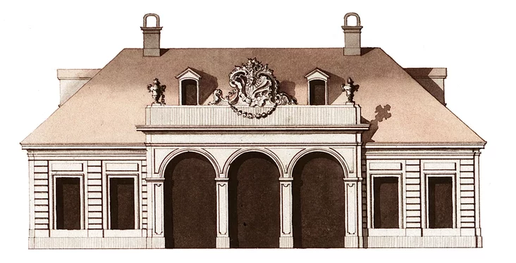 Агароджа і канструкцыя брамы са скульптурамі сфінксаў і пуці запазычана з дрэздэнскага Галандскага палаца, архітэктарам якога быў Пёпельман-старэйшы.