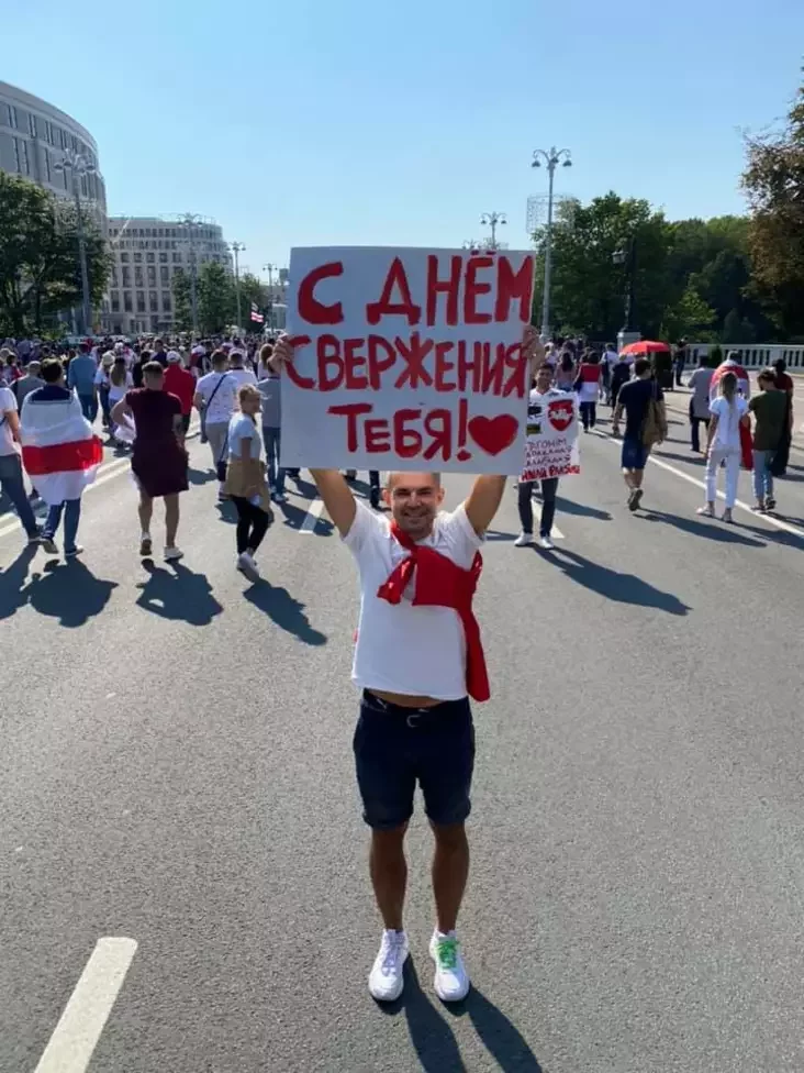 Каля Стэлы з плакатам стаіць расійскі пісьменнік беларускага паходжання Саша Філіпенка.