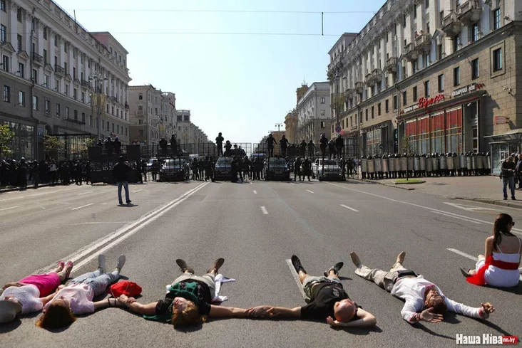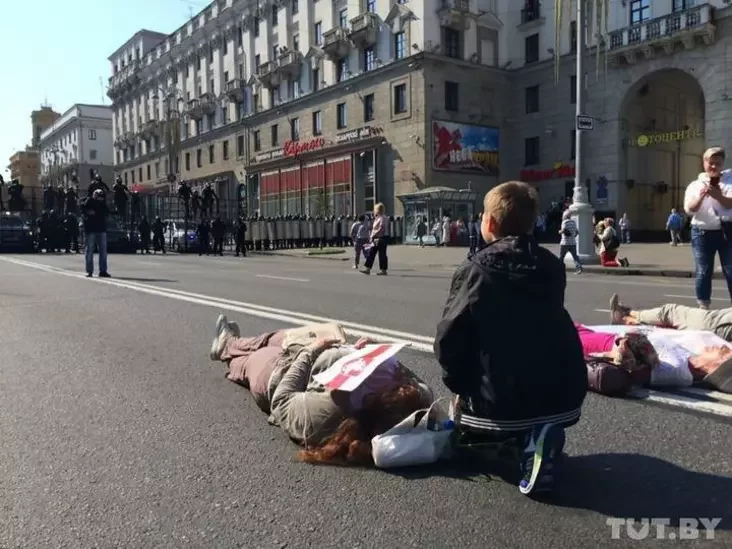 Людзі маюць шмат атрыбутыкі, плакат «Тут пакоіцца дыктатура», а таксама нясуць вялікага таракана 5 метраў.