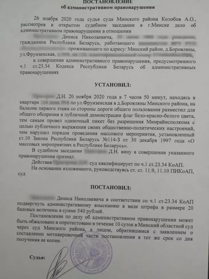 Яшчэ адзін жыхар Мінскага раёна паведаміў пра суд за сцяг на балконе. Яго судзілі 26 лістапада, таксама па ч. 1.арт. 23.34 КаАП.