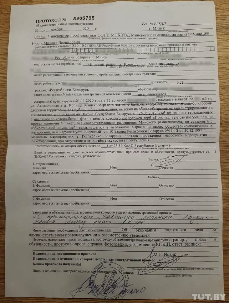 У жыхара дома на Авіяцыйнай, 3, Арцёма з Новай Баравой ёсць гісторыя яшчэ цікавейшая. Днямі яго асудзілі за сцяг унутры лоджыі.