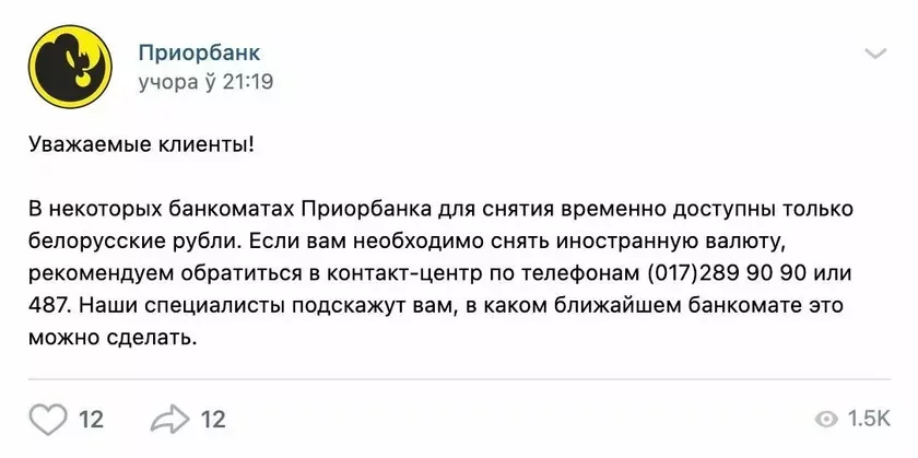 Учора ў сеціве пачала з'яўляцца інфармацыя пра тое, што ў банкаматах няма даляраў, перадусім называліся банкаматы «Прыёрбанка». Пад вечар банк сам заявіў, што ў некаторых банкаматах для зняцця часова ёсць толькі беларускія рублі. А каб зняць валюту, трэба пацікавіцца ў кол-цэнтры, дзе яна ёсць.